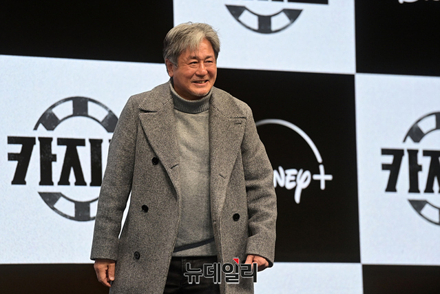 배우 최민식이 14일 오전 서울 종로구 JW 메리어트 동대문 스퀘어 서울에서 열린 디즈니+ 오리지널 '카지노(연출 강윤성)' 제작발표회에서 포즈를 취하고 있다.