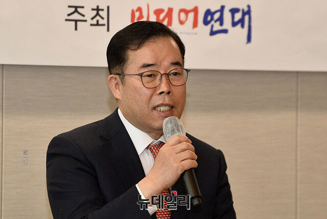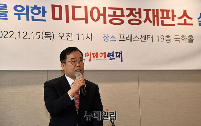 박성중 국민의힘 의원이 15일 오전 서울 한국프레스센터 19층 국화홀에서 열린 미디어연대 주최 '미디어 공정성 제고를 위한 미디어공정재판소 설립 제안' 정책포럼에 참석해 축사를 하고 있다.이날 미디어연대는 공정성을 제고하기 위해 미디어 관련 분쟁을 총괄하는 독자적인 전문법원 가칭 '미디어공정재판소(MFC: Media Fairness Court)' 설립을 놓고 법조계, 언론계 등 전문가들과 함께 국회 입법을 위한 정책방안을 모색하는 자리를 가졌다.이번 포럼에는 박성중 국민의힘 의원, 이기남 원암문화재단 이사장, 최창섭 서강대 명예교수, 문재완 외국어대 법학전문대학원 교수, 문흥수 변호사, 박우귀 전 방송통신심의위원회 방송심의2국장, 신중섭 강원대 명예교수, 김인숙 서울인실련 대표, 고영주 전 방송문화진흥회 이사장, 이형균 한국기자협회 고문 등이 참석했다.