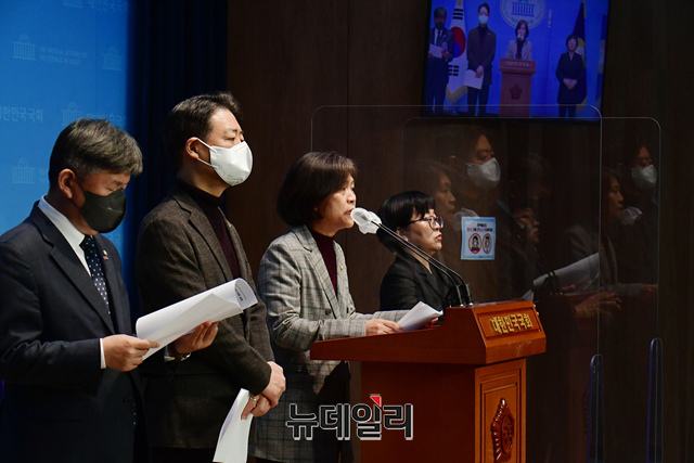 더불어민주당 교육위원회 소속 강민정, 김영호, 서동용 의원이 16일 국회 소통관에서 '2022 개정교육과정'에 대한 의결을 즉각 취소하고 재심의에 나서라"고 주장하고 있다.