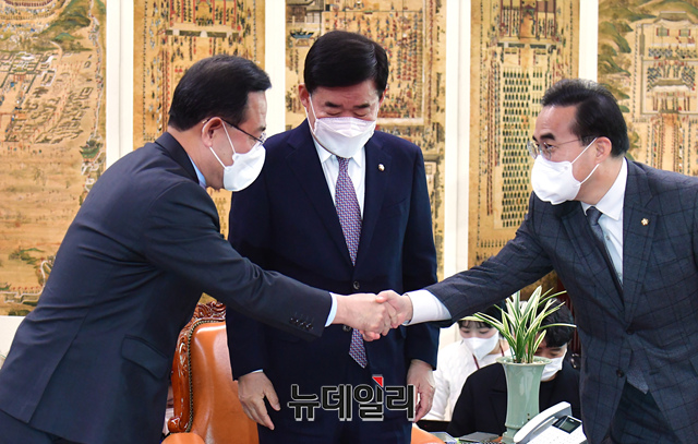 주호영 국민의힘 원내대표와 박홍근 더불어민주당 원내대표가 16일 오후 국회 의장실에서 김진표 국회의장 주재로 열린 여야 원내대표 회동에서 악수를 나누고 있다.