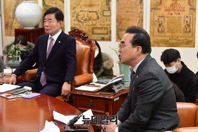 김진표 국회의장, 주호영 국민의힘 원내대표, 박홍근 더불어민주당 원내대표가 16일 오후 국회 의장실에서 열린 여야 원내대표 회동에서 대화를 나누고 있다.