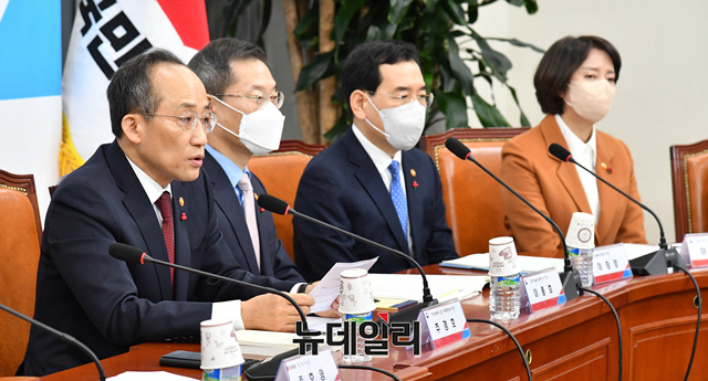 추경호 경제부총리가 19일 오전 국회에서 열린 '2023년 경제정책방향 관련 당정협의회'에 참석해 모두발언을 하고 있다.