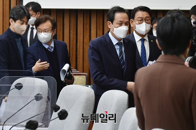우상호 국회 용산 이태원 참사 진상규명과 재발방지를 위한 국정조사특별위원회 위원장이 19일 국회에서 열린 특별위원회 전체회의를 마치고 회의장을 떠나고 있다.