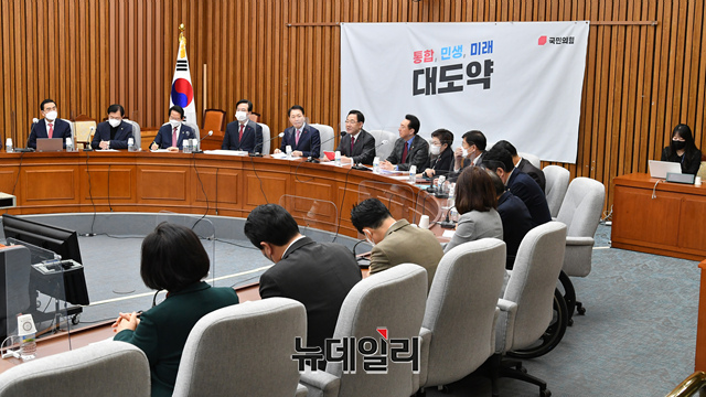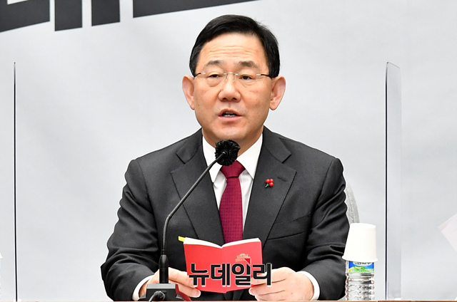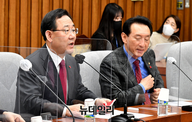 주호영 국민의힘 원내대표가 20일 오전 국회에서 열린 원내대책회의에 참석해 모두발언을 하고 있다.