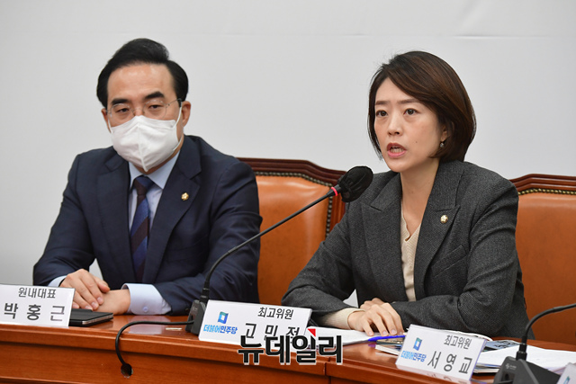 고민정 더불어민주당 최고위원이 21일 국회에서 열린 최고위원회의에서 모두발언을 하고 있다.