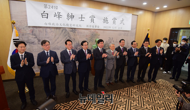 김진표 국회의장, 라종일 백봉정치문화교육연구원 이사장, 주호영 국민의힘 원내대표, 박홍근 더불어민주당 원내대표가 21일 오후 국회에서 열린 제24회 백봉신사상 시상식에서 기념촬영하고 있다.
