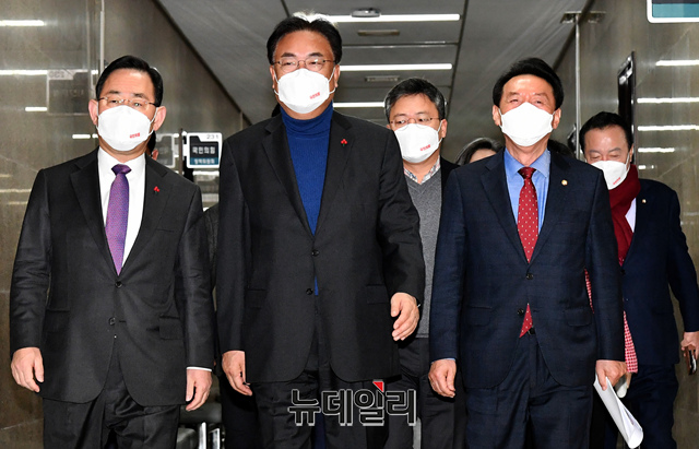 정진석 국민의힘 비대위원장 및 지도부가 22일 국회에서 열린 비상대책위원회의에 참석하기 위해 입장하고 있다.