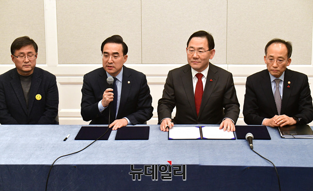 주호영 국민의힘 원내대표와 박홍근 더불어민주당 원내대표가 22일 국회에서 내년도 예산안 합의문에 서명을 하고 있다.