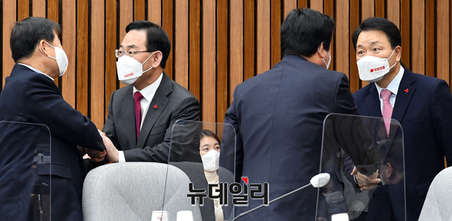 주호영 국민의힘 원내대표 및 지도부가 23일 오전 국회에서 열린 원내대책회의에 참석하기 위해 입장하고 있다.