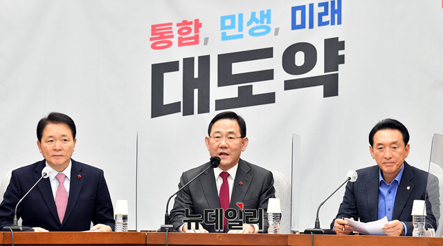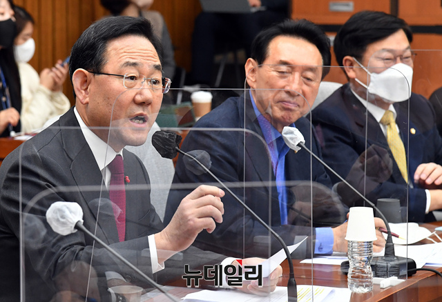 주호영 국민의힘 원내대표가 23일 오전 국회에서 열린 원내대책회의서 모두발언을 하고 있다.