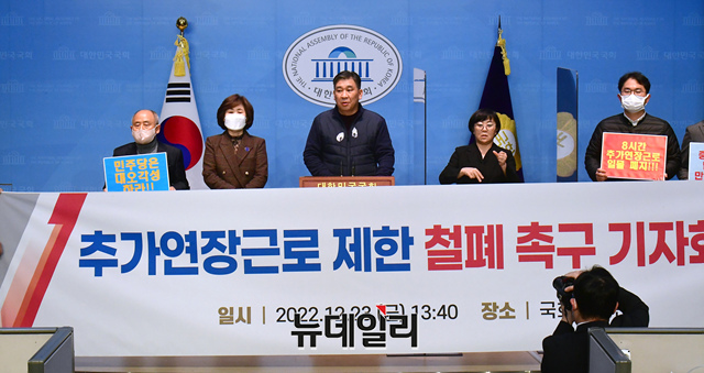 최승재 국민의힘 의원이 23일 국회 소통관에서 추가연장근로 제한 철폐 촉구 기자회견을 갖고 있다.
