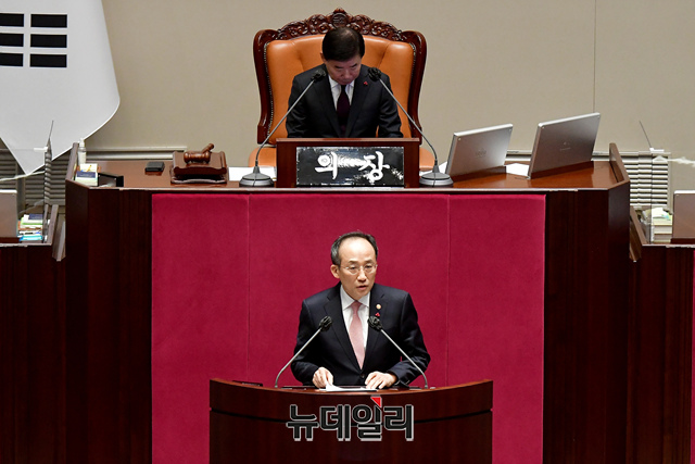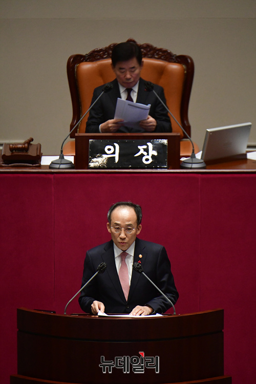 추경호 부총리 겸 기획재정부 장관이 23일 국회에서 열린 본회의에서 국세기본법 일부개정법률안 등에 대해 제안설명을 하고 있다.