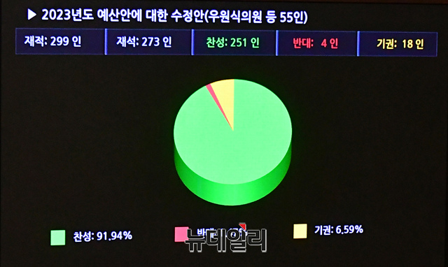 634조 5000억원 규모의 2023년도 예산안이 24일 오전 국회에서 열린 본회의에서 재석 273인, 찬성 251인, 반대 4인, 기권 18인으로 가결되고 있다.