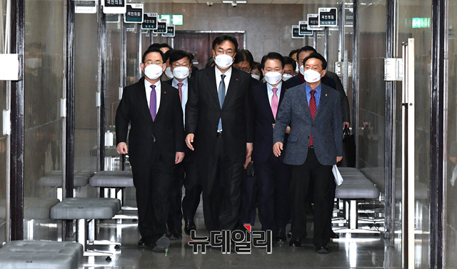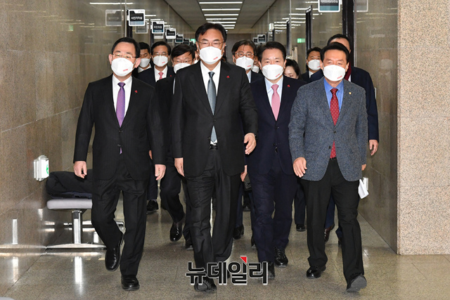 정진석 국민의힘 비상대책위원장과 주호영 원내대표 및 지도부가 26일 국회에서 열린 비상대책위원회의에 참석하고 있다.