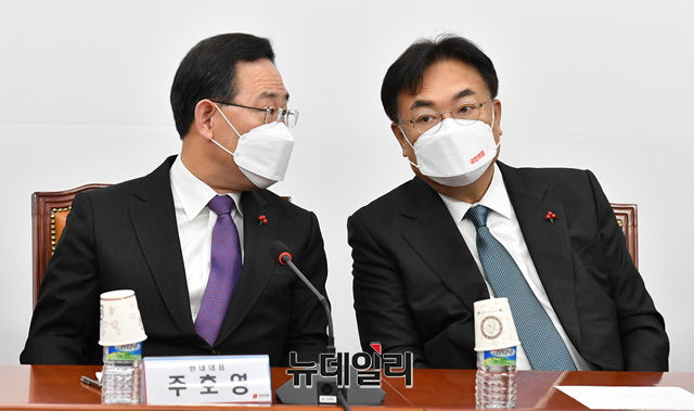 정진석 국민의힘 비상대책위원장과 주호영 원내대표가 26일 국회에서 열린 비상대책위원회의에 참석해 대화를 나누고 있다.