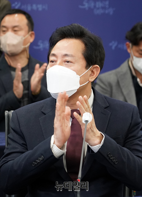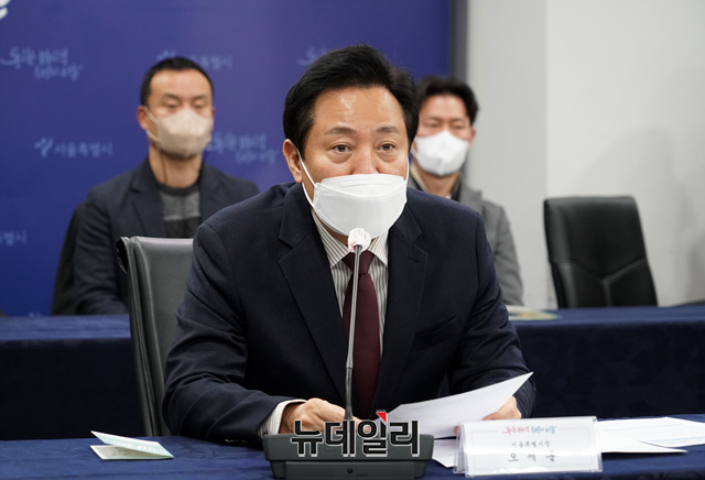오세훈 서울시장이 26일 오전 서울시청에서 열린 서울시-하나금융그룹 사회복지시설 전기차 10대 기부전달식에서 인사말을 하고 있다. (사진=서울시)