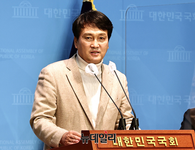 안민석 더불어민주당 의원이 26일 오전 국회 소통관에서 열린 MB사면 반대 기자회견에서 발언하고 있다.