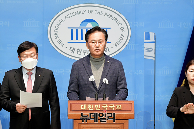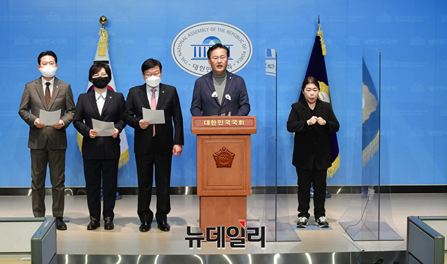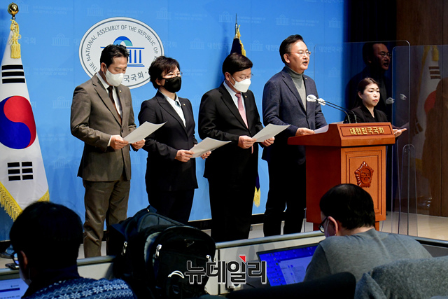 유상범 의원 및 국민의힘 법제사법위원회 위원들이 26일 오전 국회 소통관에서 검찰좌표공개 관련 기자회견을 갖고 있다.
