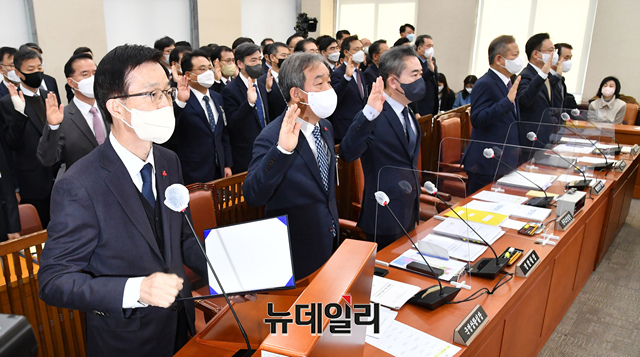 방문규 국무조정실장이 27일 국회에서 열린 용산 이태원 참사 진상규명과 재발방지를 위한 국정조사특별위원회 전체회의에서 증인 선서를 하고 있다.