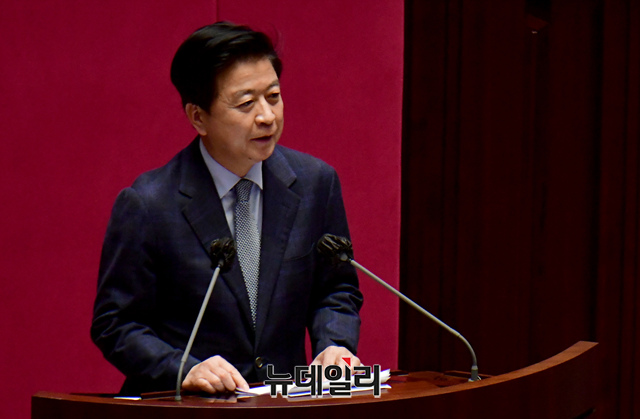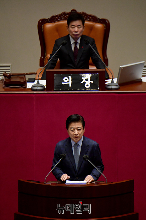 뇌물수수·정치자금법 위반 혐의를 받고 있는 노웅래 더불어민주당 의원이 28일 오후 국회에서 열린 본회의에서 본인의 체포동의안에 투표에 앞서 신상발언을 하고 있다.