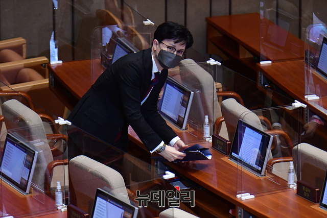 한동훈 법무부 장관이 28일 오후 국회에서 열린 본회의에서 뇌물수수 및 정치자금법 위반 혐의를 받는 노웅래 더불어민주당 의원 체포동의안 투표가 부결된 뒤 본회의장을 떠나고 있다.