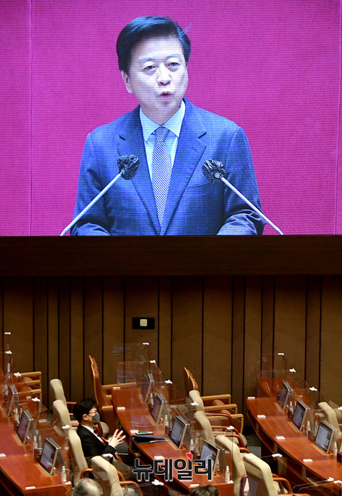 한동훈 법무부 장관이 28일 오후 국회에서 열린 본회의에서 뇌물수수 및 정치자금법 위반 혐의를 받는 노웅래 더불어민주당 의원의 신상발언을 듣고 있다.