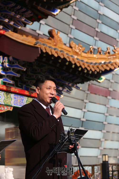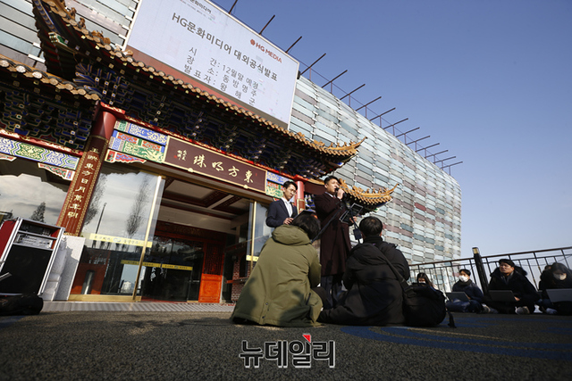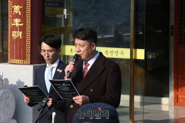 동방명주 실질 지배인 왕해군 씨가 29일 서울 송파구 소재 중국식당 동방명주 앞에서 기자회견을 하고 있다. 왕 씨는 이날 기자회견을 통해 동방명주는 중국 비밀경찰서와 무관하다는 입장을 밝혔다.