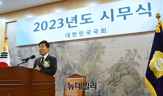 김진표 국회의장이 2일 국회에서 열린 2023년도 시무식에서 신년사를 하고 있다.