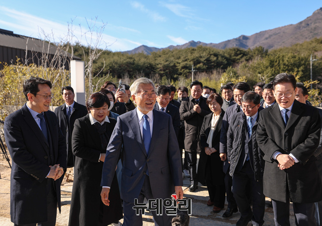 문재인 전 대통령이 2일 경남 양산시 하북면 평산마을 문 전 대통령 사저를 찾은 이재명 더불어민주당 대표를 맞이 하고 있다. (사진=더불어민주당)
