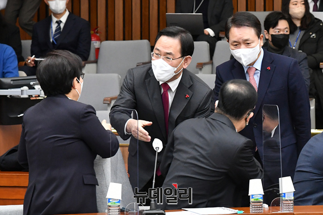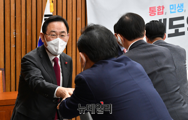 주호영 국민의힘 원내대표 및 원내지도부가 3일 오전 국회에서 열린 원내대책회의에 참석하기 위해 입장하고 있다.