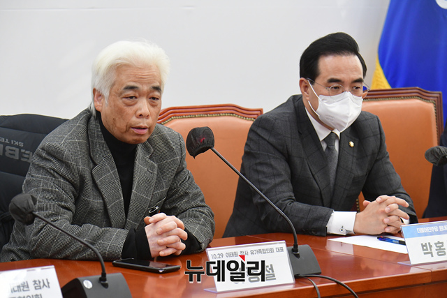이종철 이태원 참사 유가족협의회 대표가 3일 오전 국회 더불어민주당 원내대표실에서 열린 이태원 참사 유가족협의회 간담회에 참석해 발언을 하고 있다.