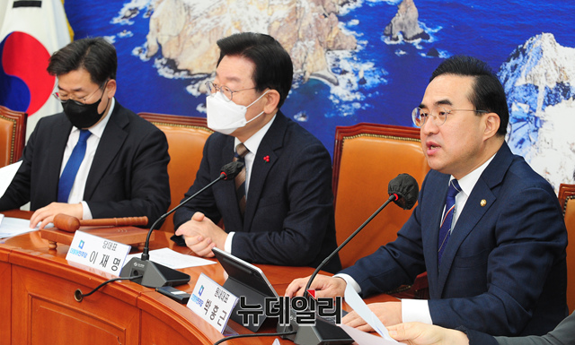 박홍근 더불어민주당 원내대표가 4일 오전 국회에서 열린 최고위원회의에서 모두발언을 하고 있다.