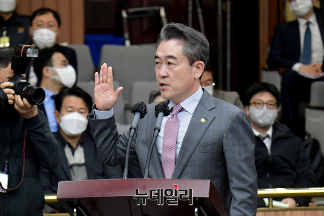 윤희근 경찰청장이 4일 오전 국회에서 열린 용산 이태원 참사 진상 규명 및 재발 방지를 위한 국정조사특별위원회 청문회에서 증인선서를 하고 있다.