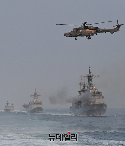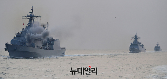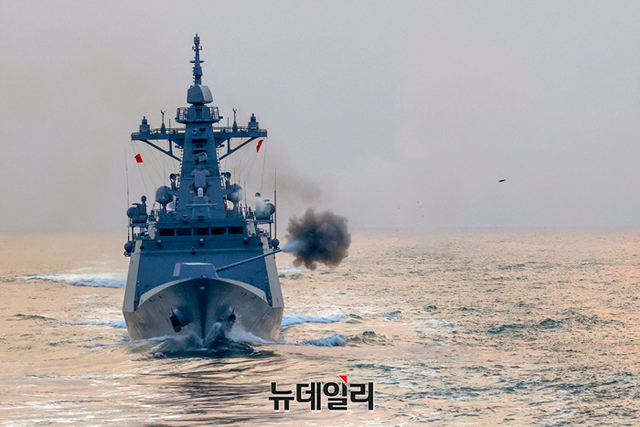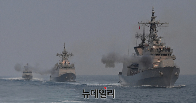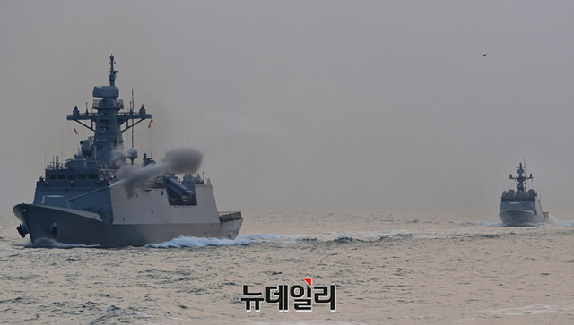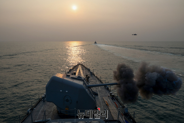 우리 해군이 4일 서해 해역에서 2023년 새해 첫 해상기동훈련을 공개했다. 훈련에 참가한 구축함인 을지문덕함이 함포사격을 하고 있다.이번 해상기동훈련은 동해, 서해, 남해 전 해역에서 해군 구축함, 호위함, 유도탄고속함, 고속정 등 함정 13척과 항공기 4대가 동시에 참가해 진행됐다.훈련은 가상의 함정과 항공기를 식별하는 것을 시작으로 고속기동과 대함·대공 사격 등을 실시했다.해군은 올해도 내실 있는 한미연합훈련을 통해 연합방위태세를 강화하고, 다양한 실전적 훈련으로 굳건한 군사대비태세를 유지할 계획이다.