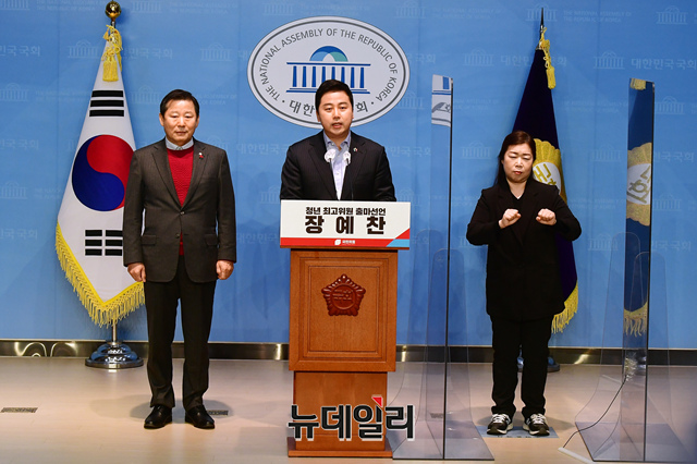 장예찬 청년재단 이사장이 5일 오전 국회 소통관에서 국민의힘 전당대회 청년 최고위원 출마를 선언하고 있다.