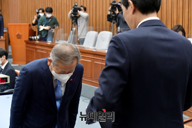 이상민 행정안전부 장관이 6일 오전 국회에서 열린 용산 이태원 참사 진상규명과 재발방지를 위한 국정조사 특별위원회 2차 청문회에서 증인선서 후 선서문을 우상호 위원장에게 전달하고 있다.