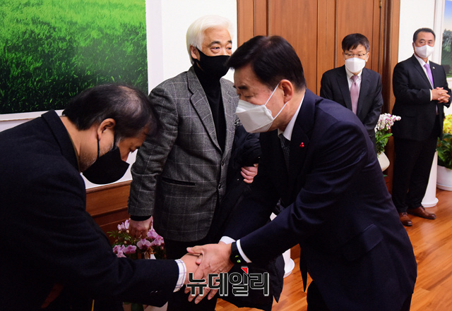 김진표 국회의장이 6일 오전 국회 의장집무실을 찾은 이태원참사 유가족들과 인사를 나누고 있다.
