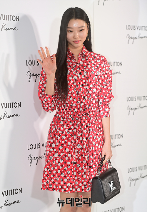 모델 배윤영이 6일 오후 서울 강남구 루이비통 메종 서울에서 열린 야요이 쿠사마 협업 컬렉션 런칭 기념행사에서 포즈를 취하고 있다.