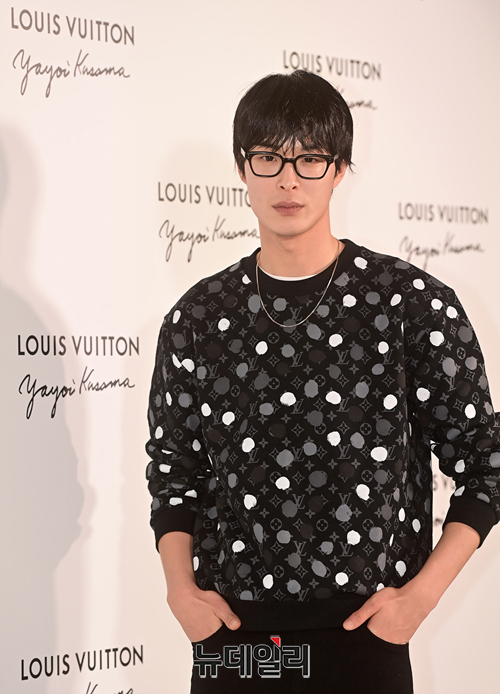 모델 박경진이 6일 오후 서울 강남구 루이비통 메종 서울에서 열린 야요이 쿠사마 협업 컬렉션 런칭 기념행사에서 포즈를 취하고 있다.