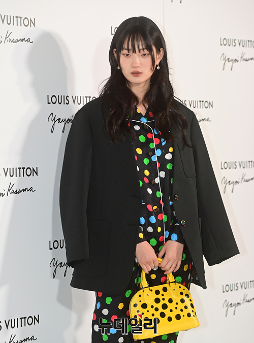 모델 신현지가 6일 오후 서울 강남구 루이비통 메종 서울에서 열린 야요이 쿠사마 협업 컬렉션 런칭 기념행사에서 포즈를 취하고 있다.