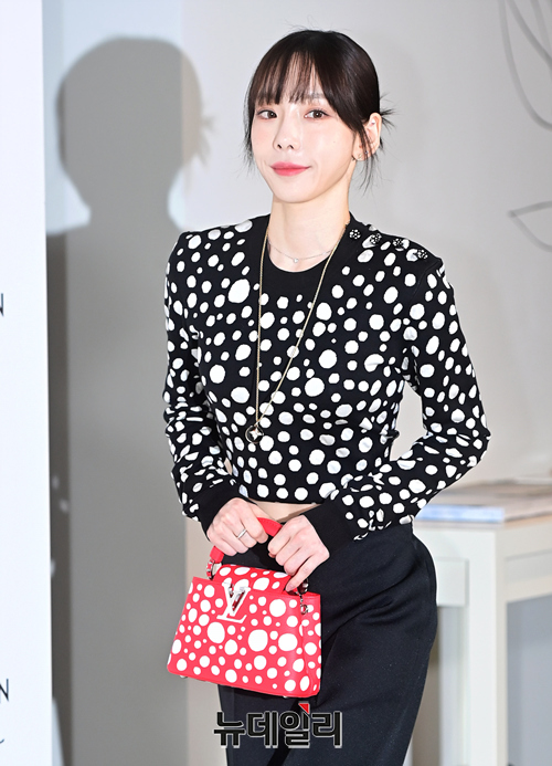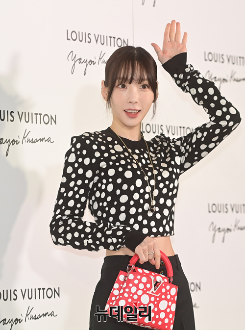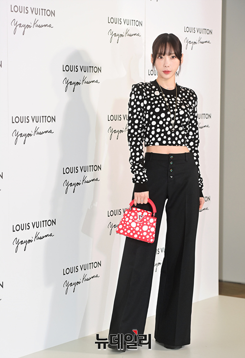가수 태연이 6일 오후 서울 강남구 루이비통 메종 서울에서 열린 야요이 쿠사마 협업 컬렉션 런칭 기념행사에서 포즈를 취하고 있다.