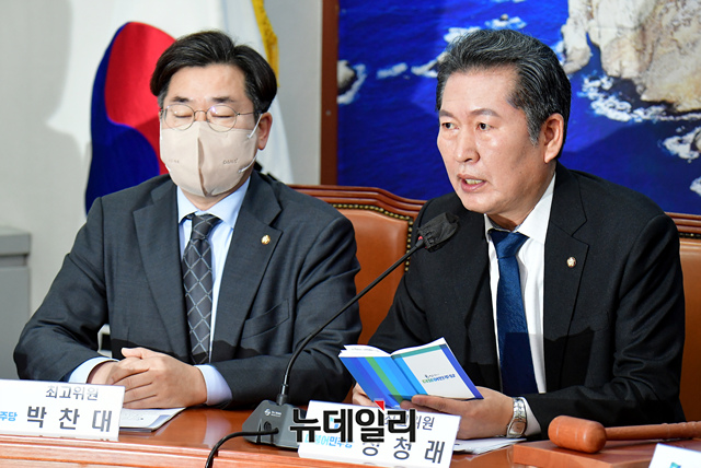 정청래 더불어민주당 최고위원이 9일 오전 국회에서 열린 최고위원회의에서 모두발언을 하고 있다.