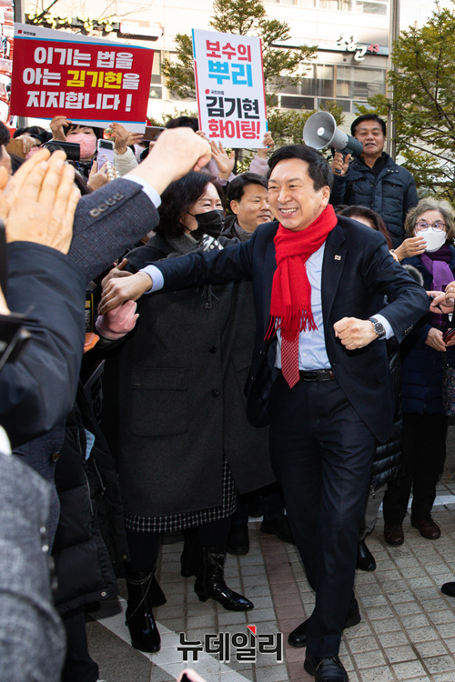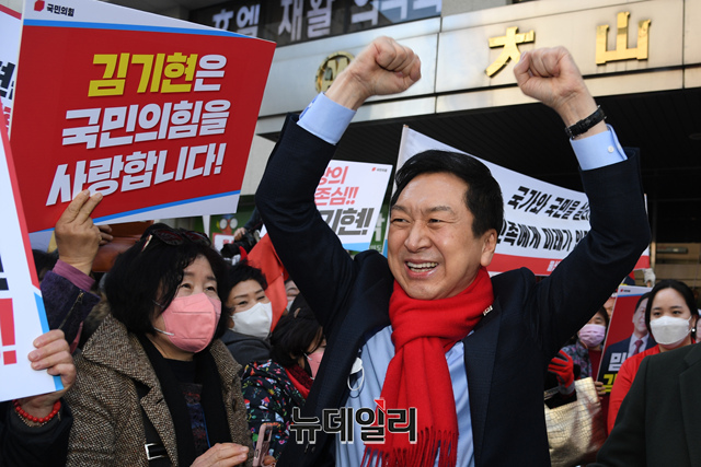 [포토] 환호에 화답하는 김기현 국민의힘 의원