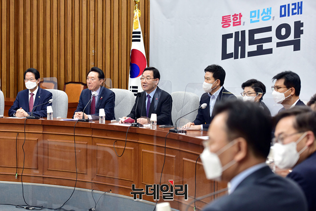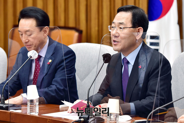 주호영 국민의힘 원내대표가 10일 오전 국회에서 열린 원내대책회의에 참석해 모두발언을 하고 있다.