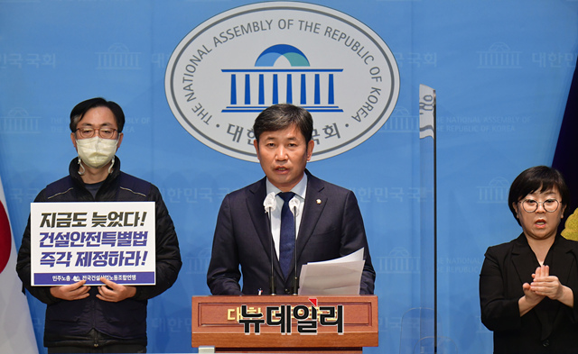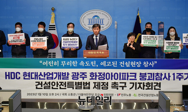 조오섭 더불어민주당 의원이 10일 오후 국회 소통관에서 광주 화정아이파크 붕괴참사 1주기, 건설안전특별법 제정 촉구 기자회견을 하고 있다.