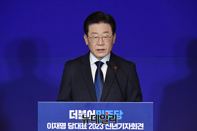 이재명 더불어민주당 대표가 12일 오전 국회 사랑재에서 열린 2023년 신년기자회견에서 취재진의 질문에 답하고 있다.