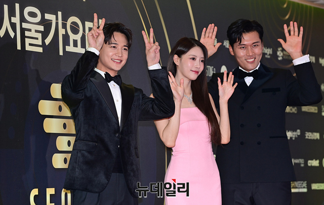 김일중, 미주, 민호가 19일 오후 서울 송파구 올림픽공원 KSPO DOME에서 열린 제21회 서울가요대상 레드카펫에서 포즈를 취하고 있다.