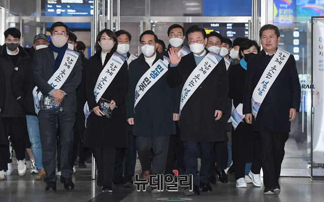 [포토] 용산역 찾은 민주당 지도부