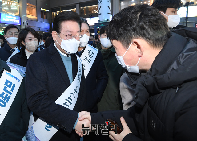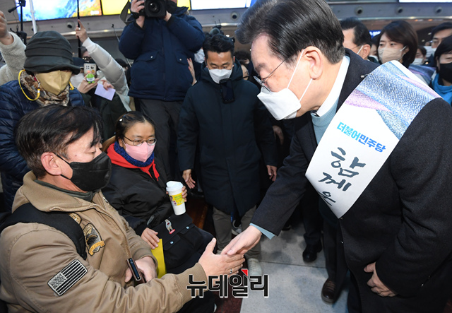 이재명 더불어민주당 대표 등 지도부가 20일 오전 서울 용산구 용산역을 찾아 설날 귀성 인사를 하고 있다.