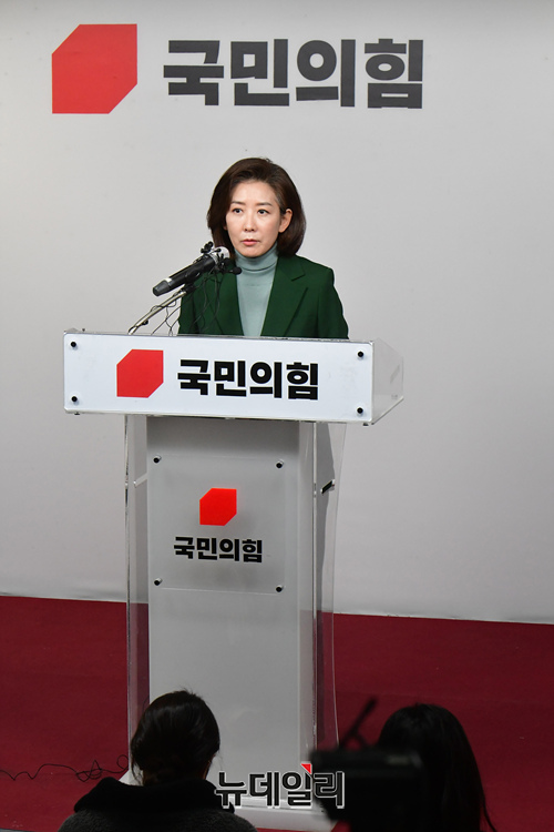 나경원 국민의힘 전 의원이 25일 오전 서울 여의도 국민의힘 당사에서 당대표 불출마 선언을 하고 있다.